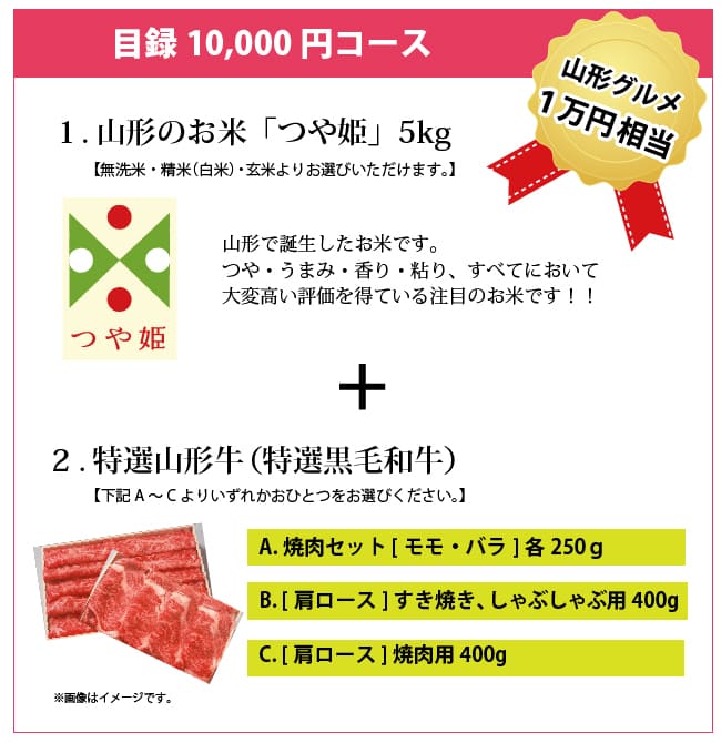 商品(山形牛、つや姫)の発送は、それぞれ生産者が異なるため、同日着ではお届けできない場合がございますのでご了承ください。