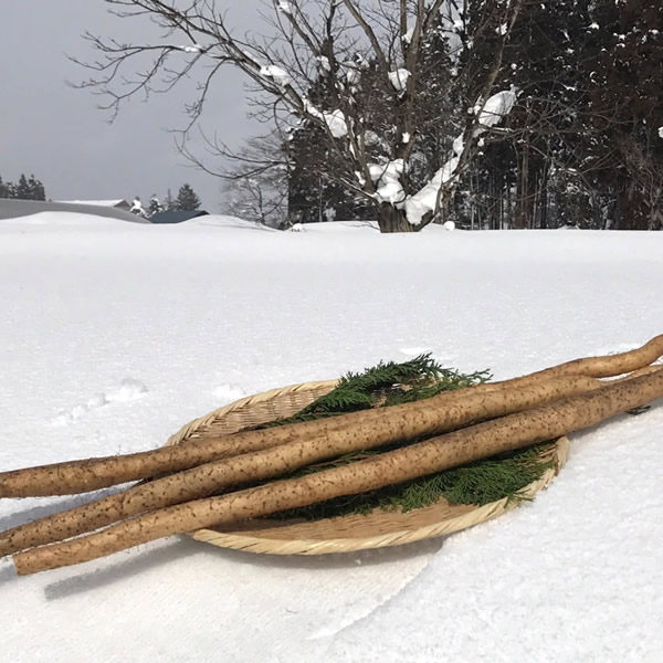 その後2メートル程の積雪の土の中で越冬させます。そうして甘くなった越冬春堀りの自然薯は、3月下旬頃より収穫となります。この越冬春堀り自然薯を雪室で貯蔵することで低温熟成され、甘みとコクがさらに増した味わいとなります。この様な豪雪地帯ならではの保存方法で、年間を通じて新鮮な自然薯がお届けできるのです。