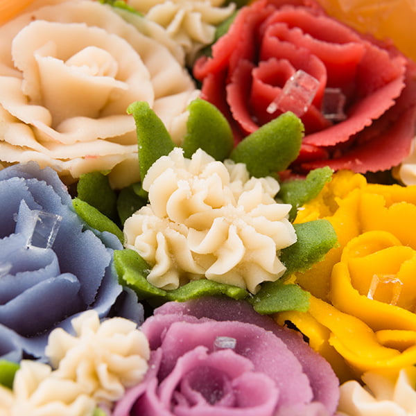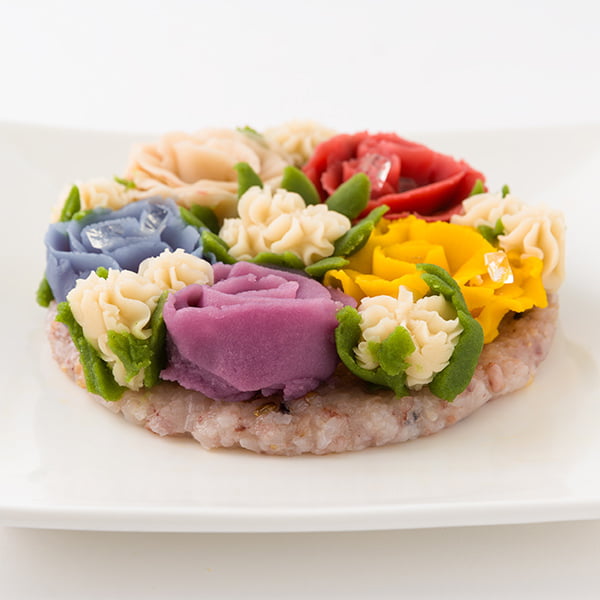 山形市の人気和菓子店かすり家が手がけるこの「花おはぎ」は、自然の素材のみで色づけした自家製の餡で作られたお花を、18雑穀米で仕上げたモチモチのおはぎの上に美しく飾り付けた和菓子です。