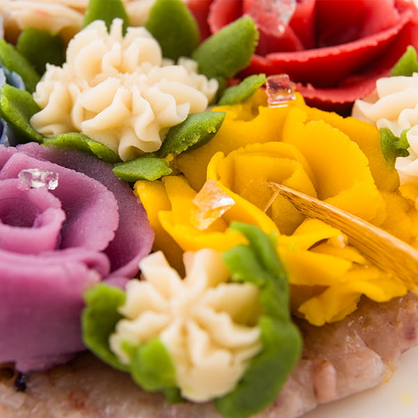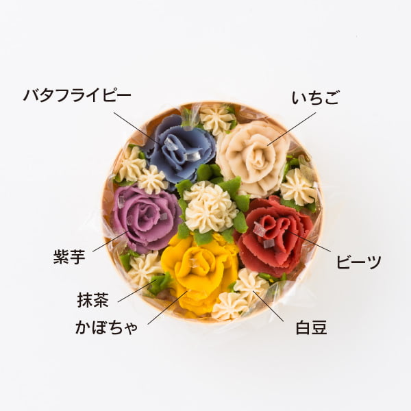 自家製餡には着色料は使わず、いちご、ビーツ、かぼちゃ、紫芋、バタフライピー、白豆、抹茶で色を付けています。素材をいかした優しい味わいですので、どのお花がどんな素材で色付けているのかな、と考えながらお召し上がりいただくのも楽しいですね。18雑穀米で作った素朴な味わいのおはぎと一緒にお召し上がりください。