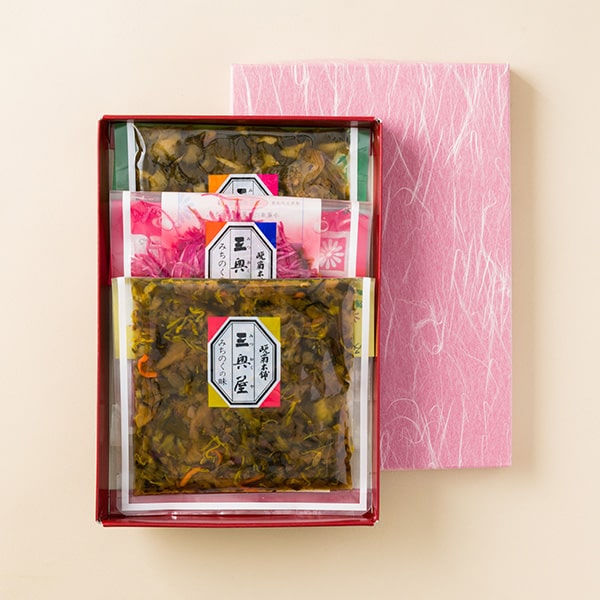 | 内容量 | ※以下の中から3種類をお選びください。 晩菊×100g 南蛮のみそ漬×90g からし漬×100g 寒菊×70g※欠品中:2024年12月再開予定 きなみ×120g さくらんぼ×80g ※欠品中:2024年10月再開予定 辛っ党×120g |