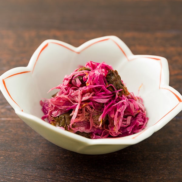 山形で「もってのほか」と呼ばれる、苦みの少ない香り高い食用菊を、花びらを散らさないように大切に甘酢で仕上げました。おひたし、酢のもの、お吸い物にもおすすめ。