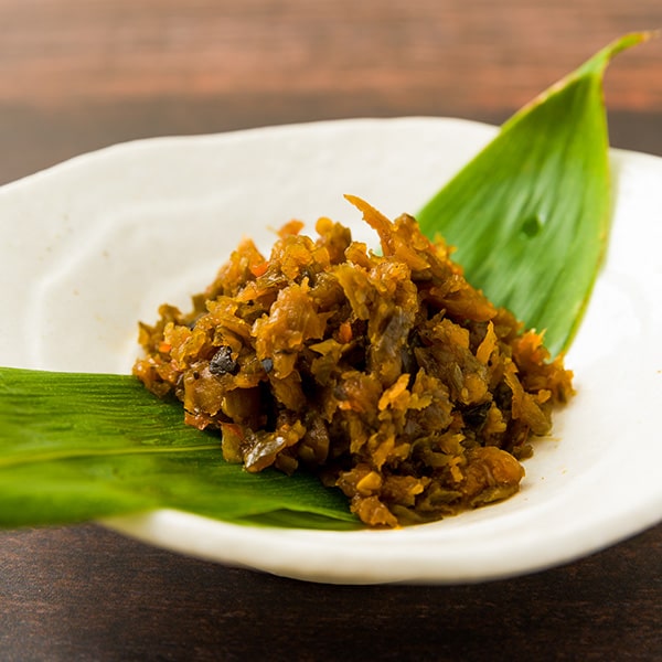 三奥屋の代名詞ともいえるお漬物です。春から秋にかけての野菜と菊花(十種類の素材)を1年以上じっくり漬け込み、刻んだものを梅酢本漬で仕上げています。さまざまな野菜の美味しさが熟成した味わい深いお漬物です。あたたかいごはんとの相性はもちろん、お茶漬けやおにぎり、お酒のお供にも最適です。