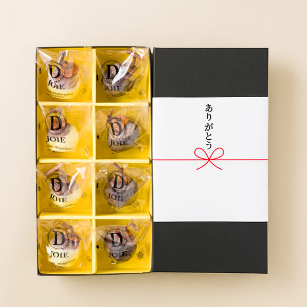 また、チョコレートはD.joieのパティシエ武田さんが選び抜いた程よい苦みのベルギー産のビターチョコと、あっさりした風味のフランス産ホワイトチョコレートを使用しています。紅干し柿の濃厚な甘さを邪魔しないよう、チョコレートと紅干し柿の相性を探るために何度も試作を重ねることによって、和と洋のそれぞれの味わいを引き立てあう極上スイーツが誕生しました。