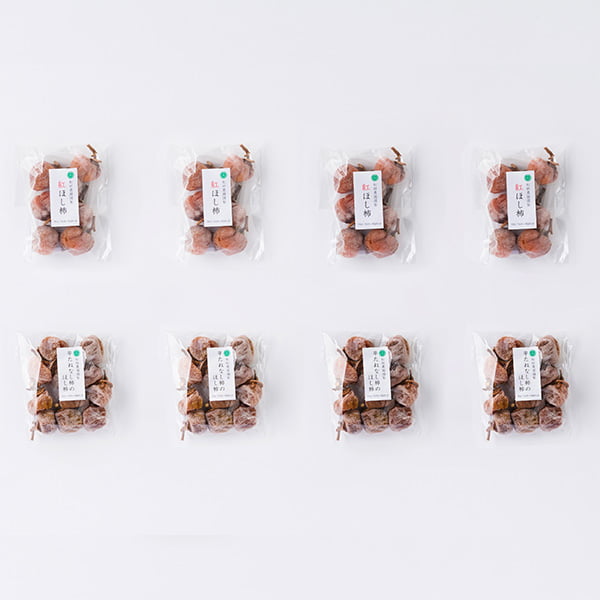 | 内容量 | 紅柿の干し柿:200g×4袋(1袋あたり6〜8個) 平たねなし柿の干し柿:240g×4袋(1袋あたり8〜10個) ※紅干し柿については、硫黄燻蒸処理をしておりません。 |