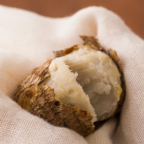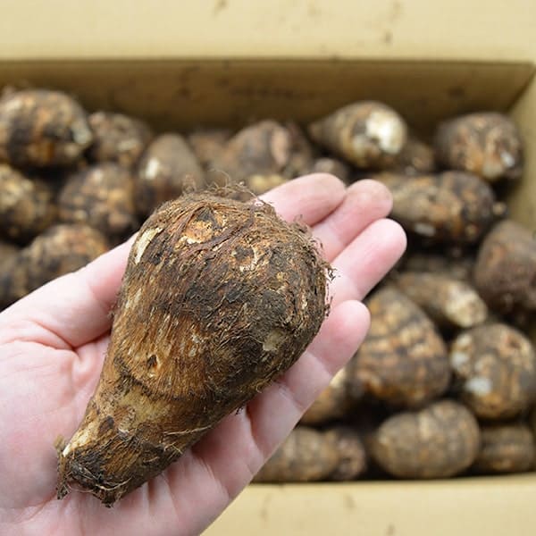 里芋の中でも日本では代表的な土垂れ(どだれ)と呼ばれる品種で、皮を剥けばまるで絹のように純白で、旨みを多く含んだねっとりとした粘りのある肉質、そして柔らかく、口の中でとろけるような食感が特徴です。