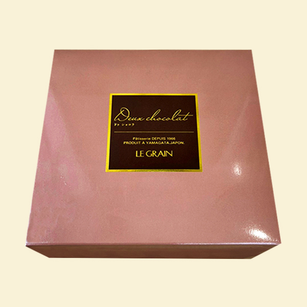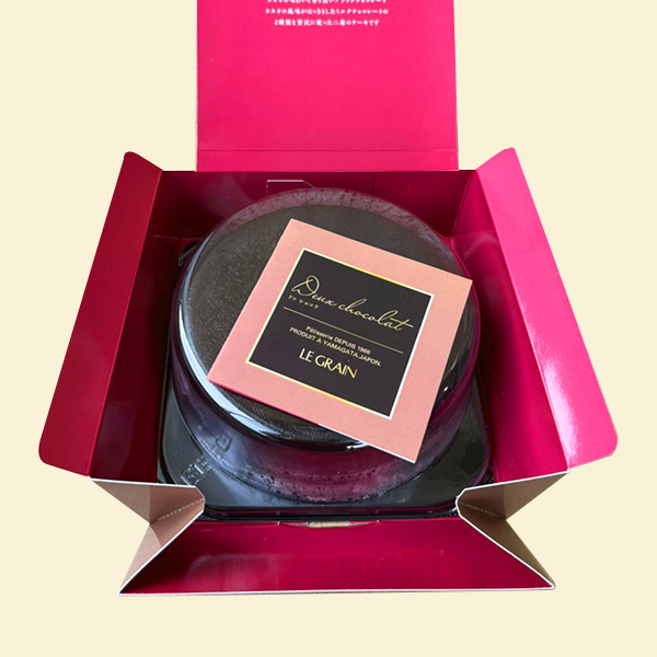 「ドゥ・ショコラ」はフランス・ヴァローナ社のミルクチョコのムースとスイートチョコのムースにショコラスポンジを重ねた、味わい深い二層のチョコレートケーキです。二層の間にはチョコレートソースを塗ったチョコレートスポンジと、飴がけのヘーゼルナッツをサンド。最後の仕上げにグラサージュをほどこしました。香りよく上品なチョコレートの風味の中にヘーゼルナッツの食感が心地よいアクセントとなった贅沢なチョコレートケーキです