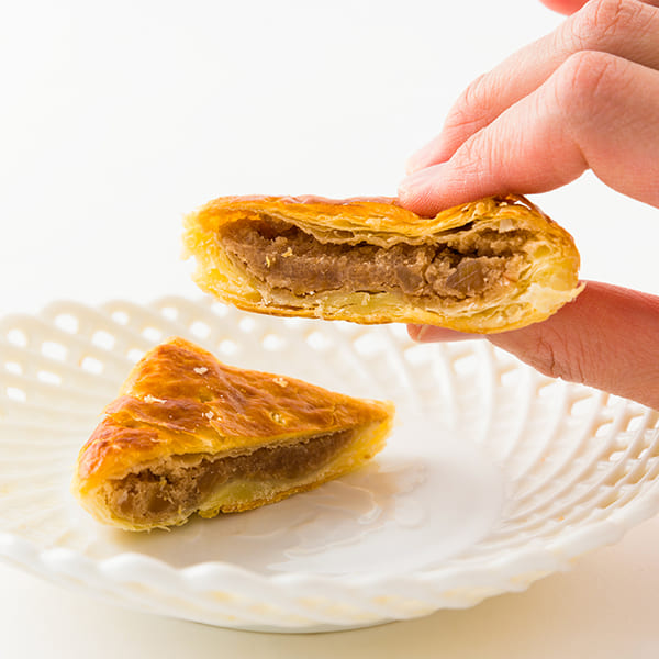 上質なヨーロッパ産の発酵バターをたっぷり使ったサクサクとしたパイ生地の中には、このこだわりの自家製餡にくるみを練りこんだ、まろやかで香り豊かな餡がたっぷり。パイ生地の風味と餡の奥深い味わいのハーモニーが満足感たっぷりのパイ菓子です。