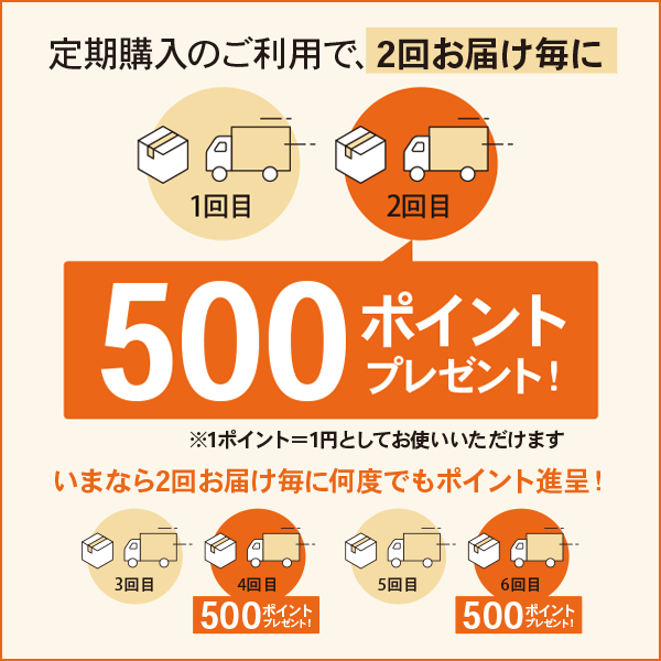定期購入商品のお届け2回ごとに何度でも500ポイントをプレゼント! 1ポイント=1円としてお使いいただけます。ぜひこの機会にご利用ください。