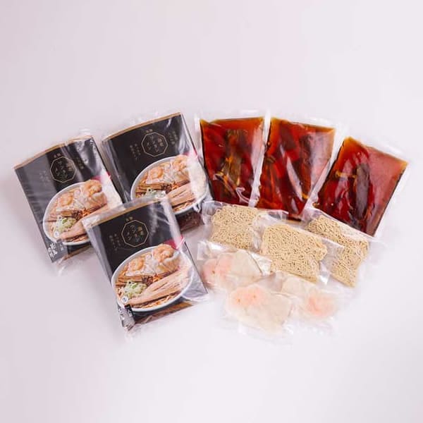 | 内容量 | 自家製麺150g×3、スープ300cc×3、(チャーシュー1枚/メンマ10g)×3、海老ワンタン2尾×3 |