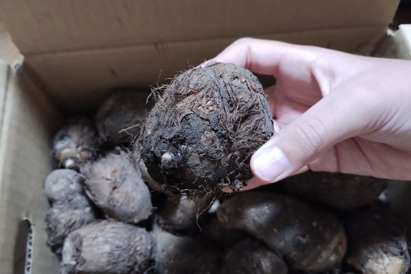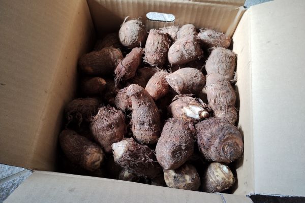 箱の中に何個入っているのか数えてみたところ、大小さまざまな里芋が43個。小さいものはピンポン玉くらいの大きさですが、大きいものは拳くらいのサイズです。