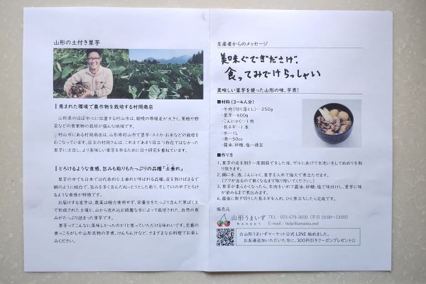 こちらは冷蔵便で届きました。箱を開けると土が付いたままの状態の里芋がゴロゴロ入っています。掘り出してすぐに出荷した感があって鮮度が良さそうですね。それと生産者の村岡さんからのメッセージ入り。これには心がホクホクになりますね、芋だけに笑