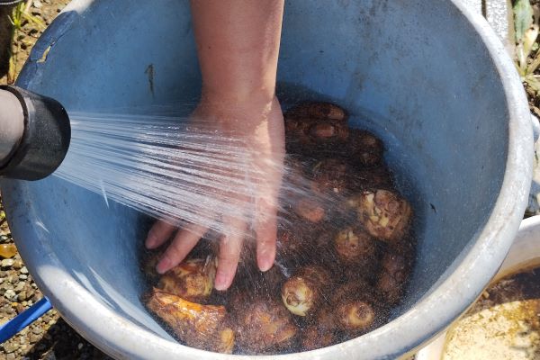 それではさっそく調理に取りかかりたいところですが、まずは調理の前に水洗いして土を落とします。さすがに台所では洗えないので、庭の水まき用のホースとバケツを使って里芋の土を落としていきます。