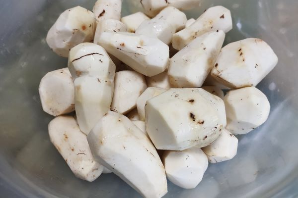 そして、ある程度まで土が落ちたら、そのまま皮をむきます。むいた状態がこちら。予想以上に真っ白ですね。大きいものは食べやすい大きさに切ります。