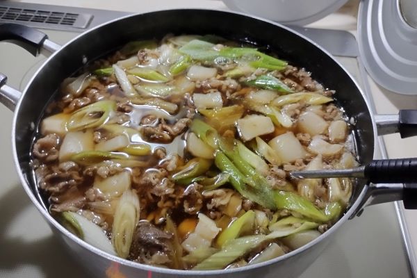 里芋、こんにゃく、牛肉、舞茸、の順番で鍋に投入し煮込んでいきます。味付けはベーシックなしょう油味。芋が柔らかくなったら最後に長ネギを入れて完成です。