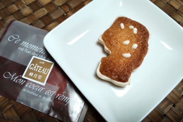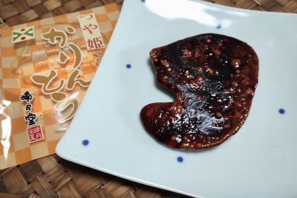 少し話題がずれてしまいましたが、それではさっそくいただきましょう。こちらはつや姫の米粉を使って一つ一つ手作りで仕上げているとの事。見た目は山形県の形をしていますが、確かに手作り感があって面白いですね。黒糖は歯にくっつくほどの濃密さで、優しい甘さが口いっぱいに広がります。