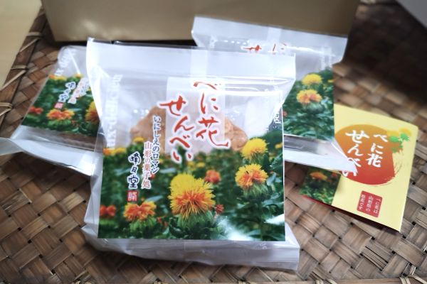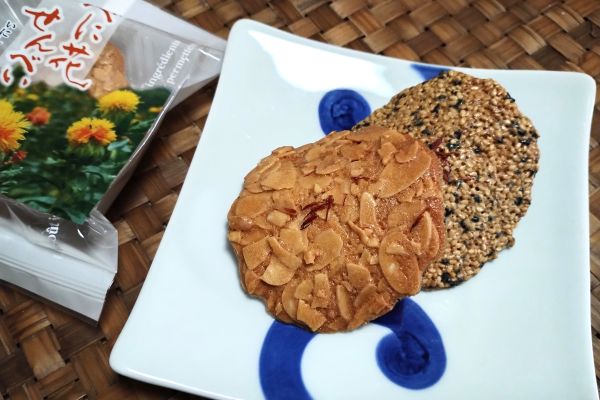 最後にべに花せんべい。こちらはゴマとアーモンド2種類あって、アーモンド2枚、ゴマ1枚の組み合わせです。そして、プラスチック製のトレーに入っているので、これなら割れる心配はなさそうです。バターの甘い香りとアーモンド、ゴマの香ばしさがマッチして美味しいですね。紅花がトッピングされていて見た目も高級感があります。名前はせんべいですが、まるでクッキーのようなサクサクした食感で、緑茶よりも紅茶に合いそうです。