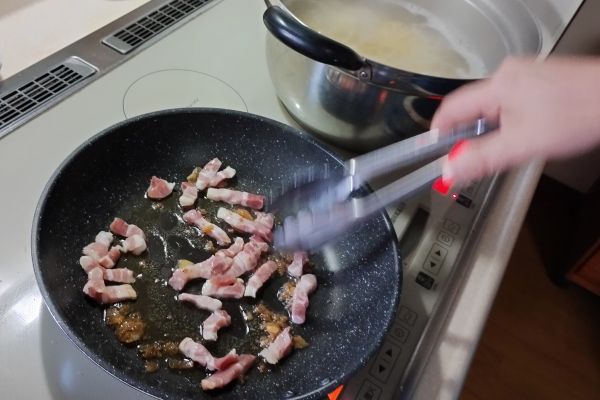 まずはガーリックオイルでパンチェッタを軽く炒めます。火にかけた途端、にんにくの香りがキッチンから家全体に広がって、さながらイタリアンレストランのようです。