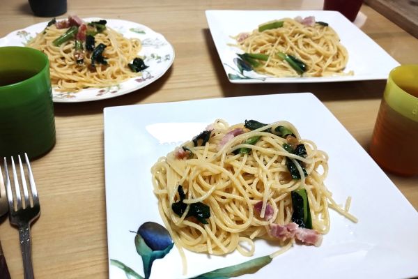 続いてパスタ料理を作りましょう。パンチェッタと小松菜のスパゲッティです。