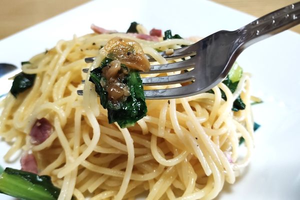 にんにくの粒々感がほどよく残っていて、こうばしさが口いっぱいに広がります。パンチェッタと小松菜も主張しすぎず、にんにくの美味しさを引き立ててくれていますね。