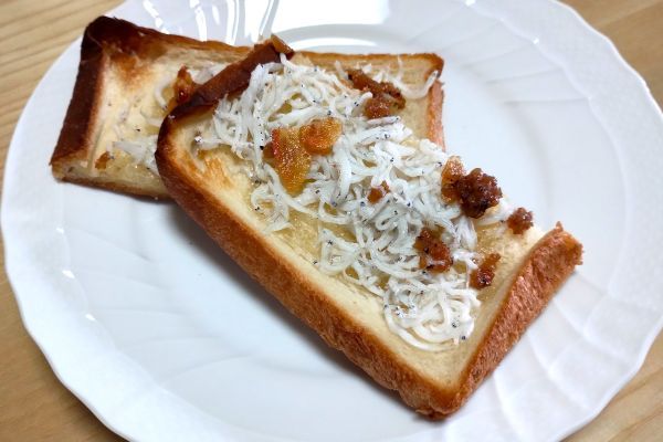 最後にもう一品。食パンにしらすを敷き詰めて、ガーリックオイルを乗せて、トースターで焼きました。